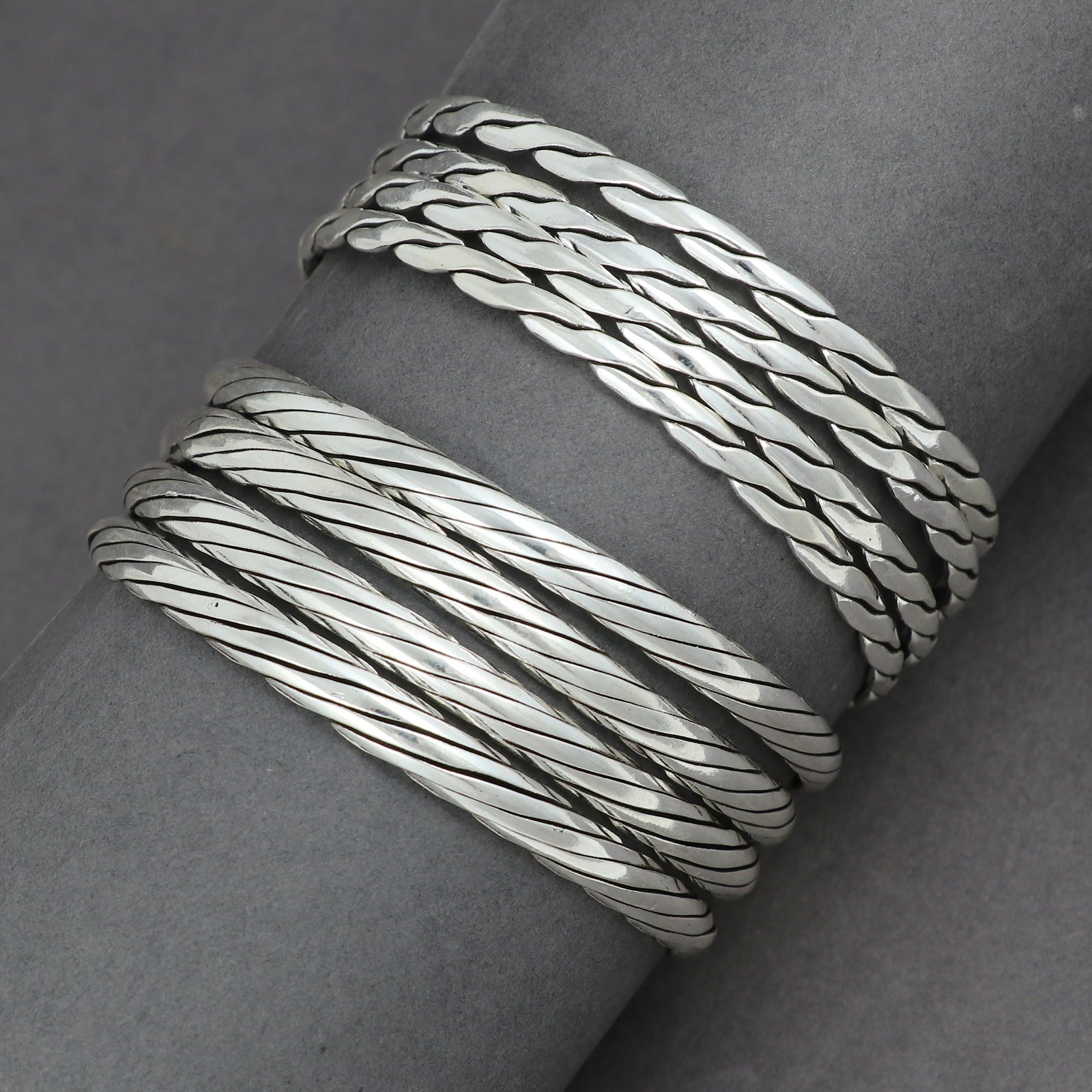 Introducing the Intertwined Elegance Silver Bangles, a stunning addition to your jewelry collection that combines sophistication with contemporary style. Crafted from high-quality silver, these bangles feature a unique knotted design that adds an artistic flair and modern twist to your ensemble. The sleek, polished finish reflects light beautifully, making them perfect for both casual outings and formal events. Designed for comfort, these bangles are lightweight and easy to wear, allowing you to showcase your style effortlessly, whether worn alone or stacked with other pieces for a bolder statement.