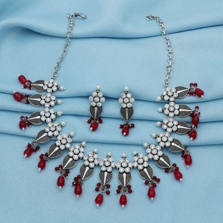 The Maroon Mystique Oxidized Silver Set is a striking combination of traditional charm and modern sophistication. This exquisite set features oxidized silver jewelry adorned with deep maroon jewels, creating a captivating contrast that enhances its overall allure.