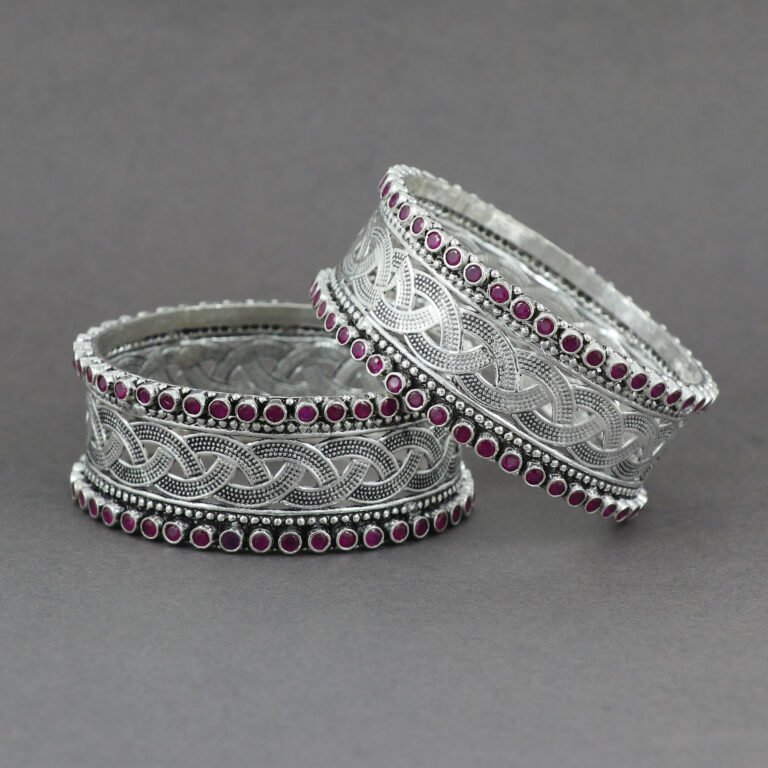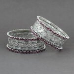 Elevate your party ensemble with the Radiant Silver Allure Bangle Set, crafted from oxidized German silver. These bangles feature intricate designs that blend vintage charm with contemporary style, making them perfect for special occasions. Their lightweight yet sturdy construction ensures comfort while adding a touch of sophistication to your outfit. Whether you’re dressing up for a festive celebration or making a bold statement at a party, these bangles exude elegance and style, turning heads wherever you go.