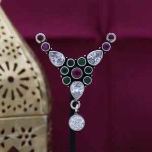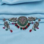 Adorn yourself with the regal beauty of the Rani Peacock Haar MehGreen, an exquisite necklace set designed to reflect royal elegance. This stunning haar features intricate peacock motifs, symbolizing grace and beauty, with a striking combination of oxidized silver and mehendi green accents. The detailed craftsmanship brings out the brilliance of traditional design, making it an ideal piece for weddings, festivals, or special occasions. The necklace is paired with matching earrings to complete the look. Its lightweight structure ensures comfort while delivering a bold, majestic statement.