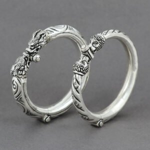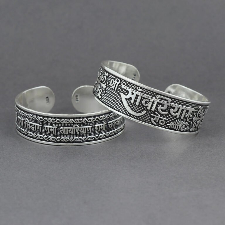Discover the perfect blend of tradition and style with the Sanskrit Elegance Cuff Set. These oxidized silver-tone bangles feature intricate Sanskrit engravings that evoke a sense of cultural heritage. The fine detailing and textured finish offer an artisanal charm, making them a versatile addition to both ethnic and contemporary outfits. Lightweight yet sturdy, these cuffs are ideal for anyone looking to embrace timeless designs with a modern edge. Whether worn on festive occasions or as a statement piece for daily wear, they embody elegance and craftsmanship at its fines
