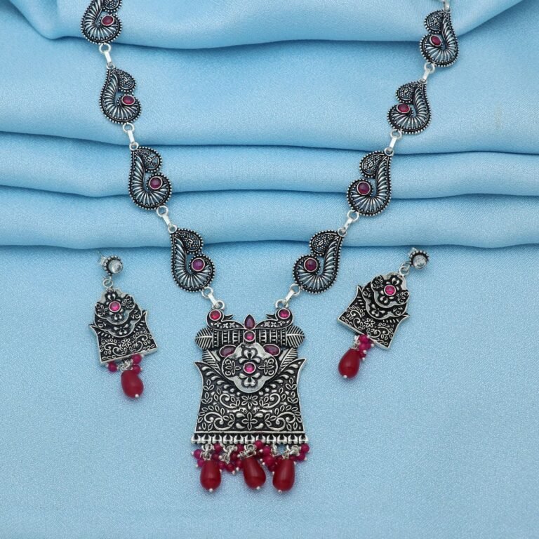 Discover timeless elegance with the Silver-Plated German Necklace & Earrings Set, a perfect blend of traditional craftsmanship and modern design. This exquisite set features a beautifully crafted German silver-plated necklace that reflects a unique metallic sheen, adding a touch of grandeur to any outfit. Paired with matching earrings, the set is designed to complement ethnic, fusion, or contemporary attire. The intricate detailing and antique finish lend a vintage charm, making it an ideal choice for festive occasions, weddings, or special events. Lightweight yet durable, this set offers all-day comfort and enduring style.
