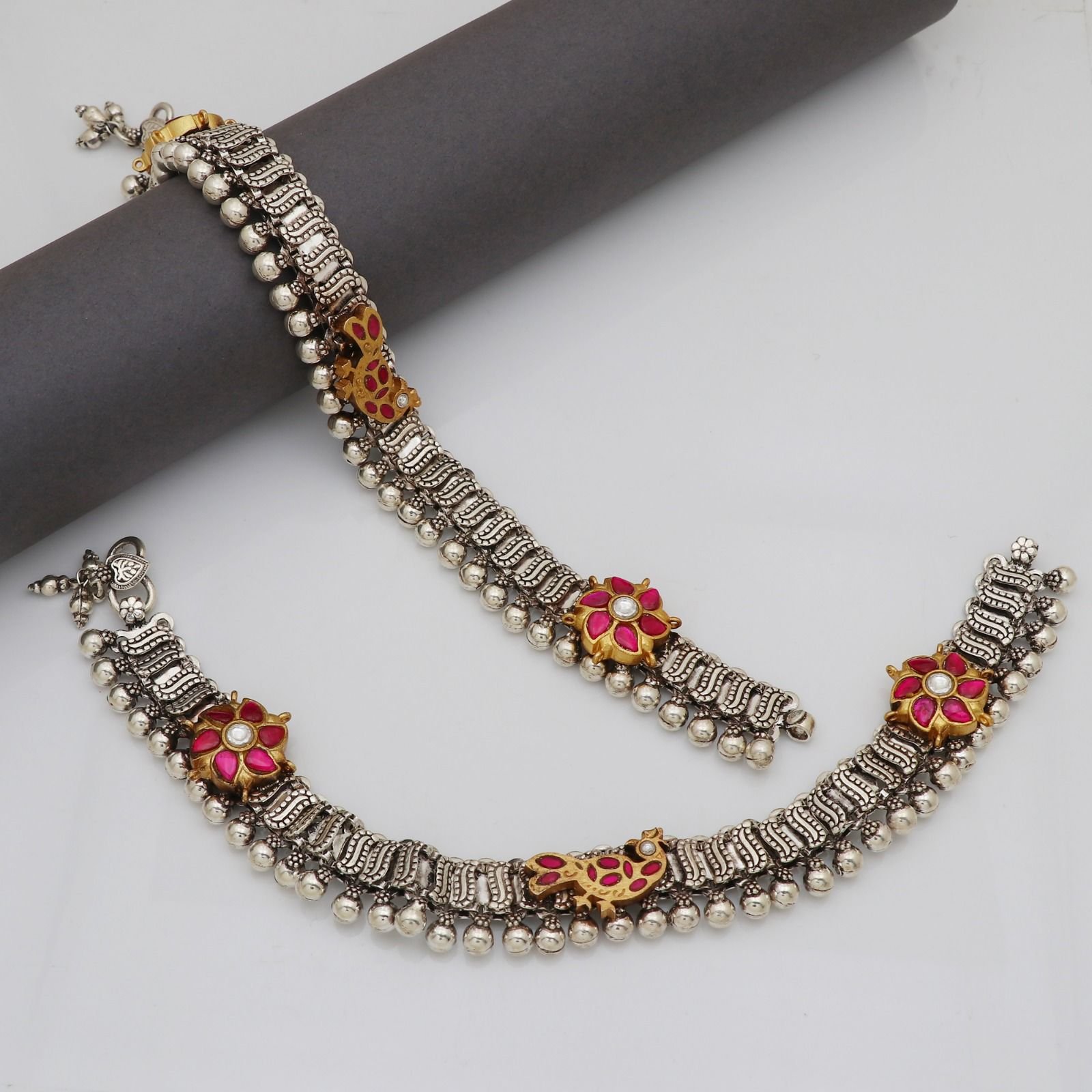 Adorn your ankles with the elegance of the Sohira Kundan Polki Anklets, crafted in sterling silver with a luxurious two-tone finish. These payals beautifully blend the timeless charm of Kundan and the sparkle of Polki, making them a must-have for traditional and contemporary occasions alike.