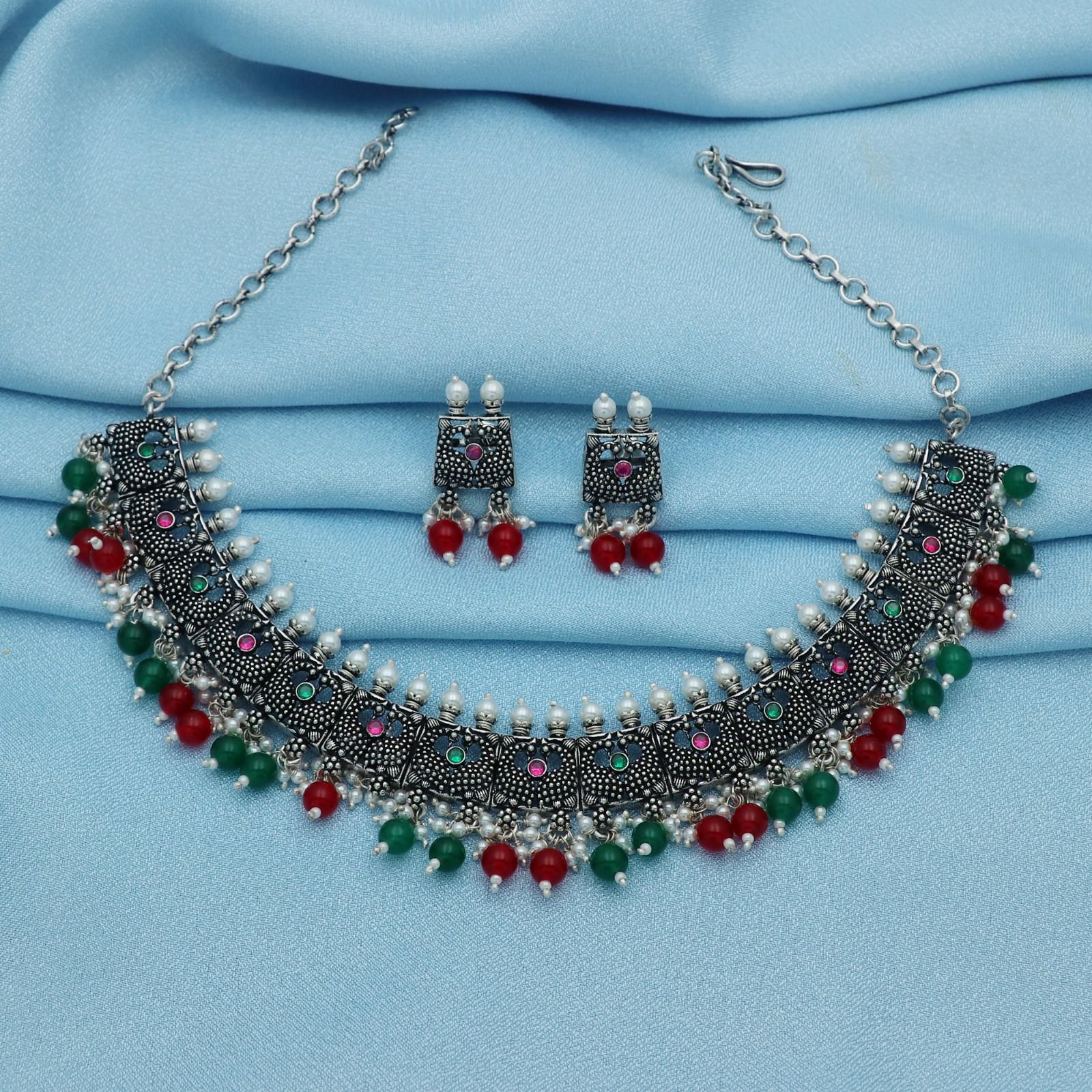 TEEJH Symmetric Multi-colored Silver Necklace Set