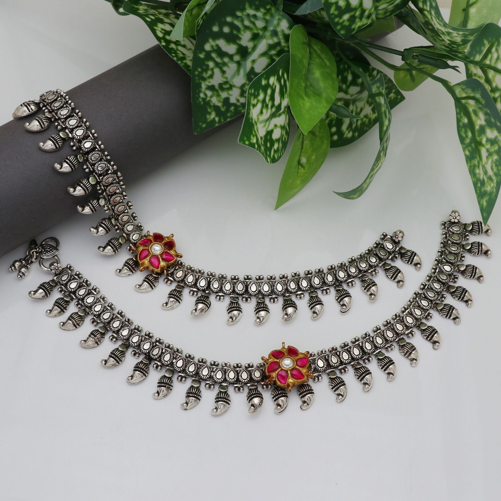 This image showcases an exquisite silver-colored anklet that exudes traditional charm. The anklet is richly adorned with numerous small, bell-shaped charms that create a delightful jingle with movement. At the center of the anklet, there are larger decorative elements highlighted by vibrant red and green gemstones, adding a pop of color to the metallic sheen. The intricate detailing on each segment of the anklet reflects skilled craftsmanship and attention to detail. This piece is elegantly displayed on a dark cylindrical stand which contrasts beautifully against the crisp white background, while lush green foliage adds a natural touch to the presentation.