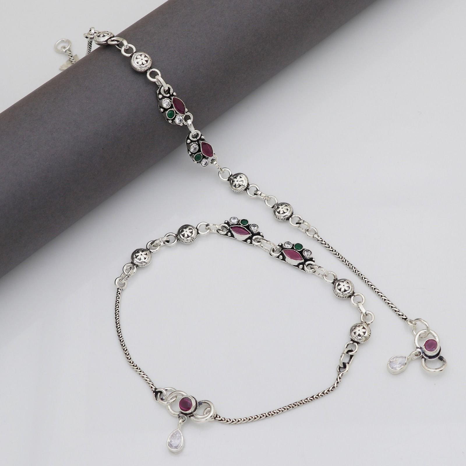 This image showcases an exquisite silver anklet that exudes traditional elegance. The anklet is beautifully crafted with intricate details, featuring a series of floral charms interspersed with spherical elements, all in lustrous silver. Each floral charm is delicately accented with vibrant red and black gemstones, adding a touch of color and sophistication to the piece. The design includes an adjustable chain that ensures a comfortable fit for the wearer, secured by a reliable lobster clasp. This piece of jewelry is not only interesting for its aesthetic appeal but also for its potential to complement various attire choices, making it a versatile addition to any jewelry collection.